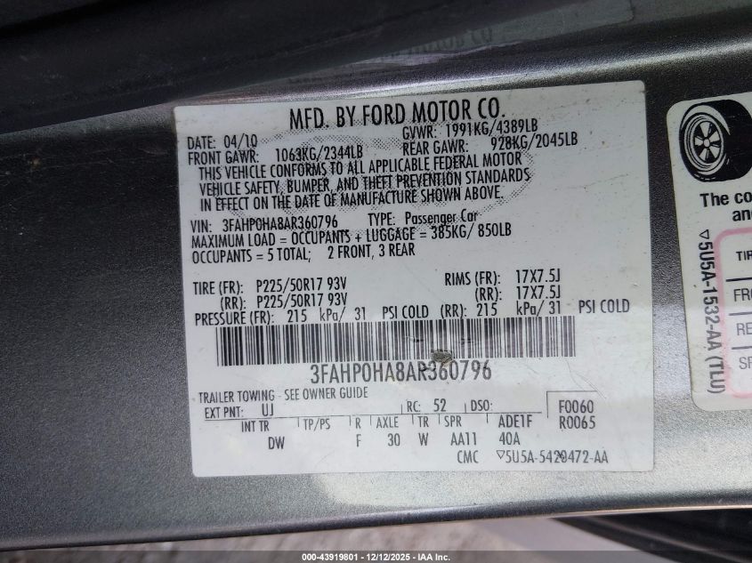 Цвет СерыйЦилиндры 4Привод Передний приводVIN 3FAHP0HA8AR360796Состояние СтационарноПовреждения Передняя или задняя AutoRIA