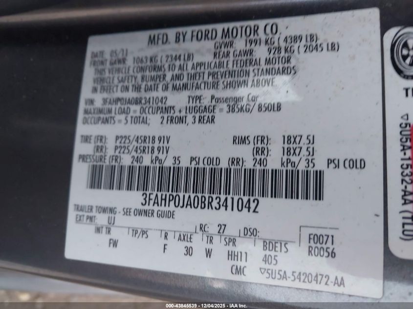 2011 FORD FUSION 2011 року Бензин, 2.5, Передний привод, vin - 3FAHP0JA0BR341042 из США