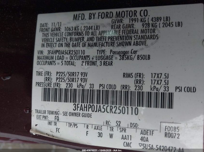 Цвет БургундияЦилиндры 4Привод Передний приводVIN 3FAHP0JA5CR250110Состояние Заводится и едет (проверено)Повреждения Задняя AutoRIA