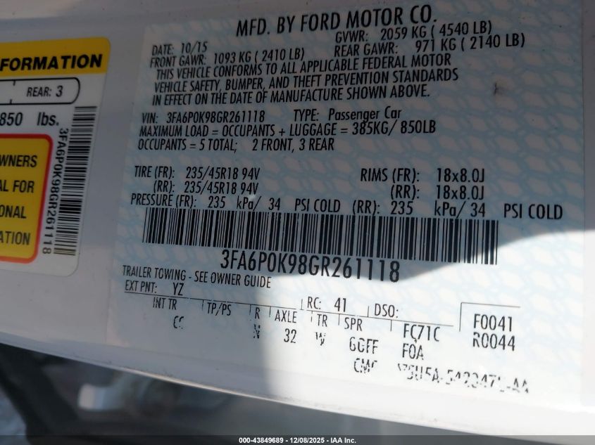 2016 FORD FUSION 2016 року Бензин, 2.0, Передний привод, vin - 3FA6P0K98GR261118 из США