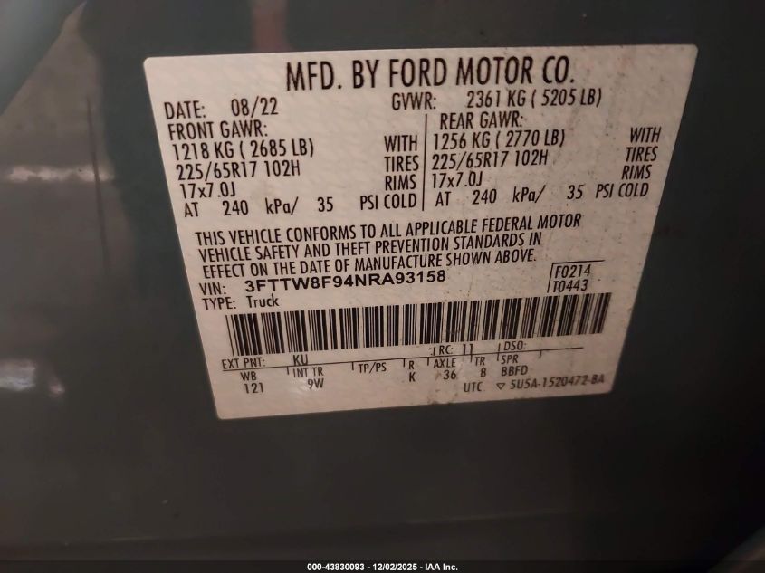 Цвет СерыйЦилиндры 4Привод Полный приводVIN 3FTTW8F94NRA93158Состояние Заводится и едет (проверено)Повреждения Передняя или задняя AutoRIA