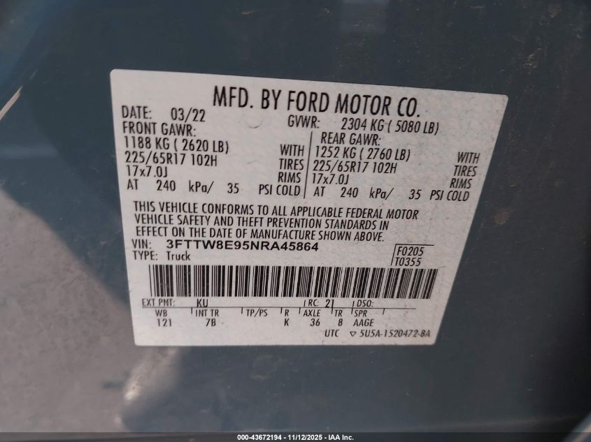 Цвет СинийЦилиндры 4Привод Передний приводVIN 3FTTW8E95NRA45864Состояние СтационарноПовреждения Передняя левая AutoRIA