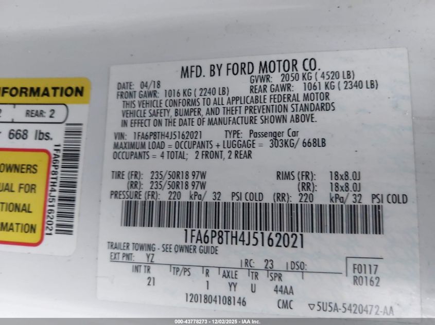 Цвет БелыйЦилиндры 4Привод Задний приводVIN 1FA6P8TH4J5162021Состояние СтационарноПовреждения Задняя AutoRIA
