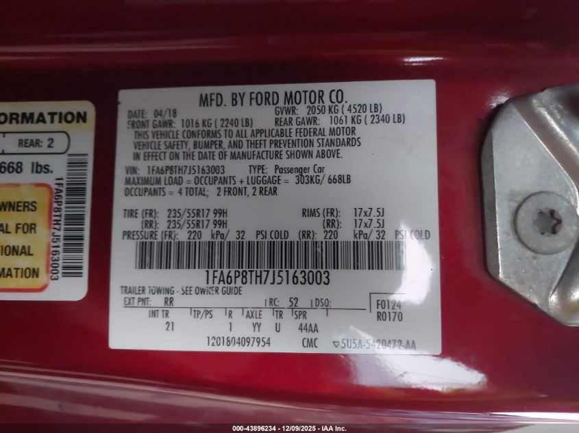 Цвет КрасныйЦилиндры 4Привод Задний приводVIN 1FA6P8TH7J5163003Состояние СтационарноПовреждения Передняя правая AutoRIA