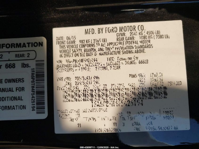 Цвет ЧерныйЦилиндры 4Привод Задний приводVIN 1FA6P8TH4F5425194Состояние Заводится и едет (проверено)Повреждения Неизвестно AutoRIA