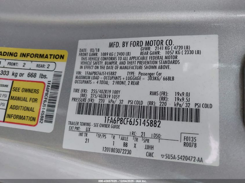 Цвет СеребряныйЦилиндры 8Привод Задний приводVIN 1FA6P8CF6J5145882Состояние СтационарноПовреждения Передняя или задняя AutoRIA