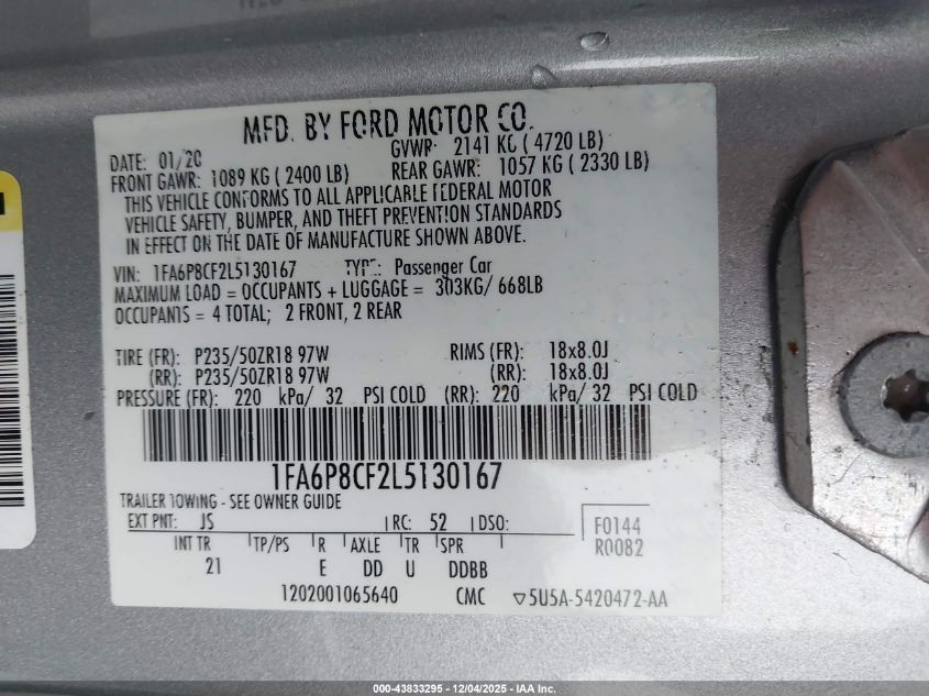 Цвет СеребряныйЦилиндры 8Привод Задний приводVIN 1FA6P8CF2L5130167Состояние Заводится и едет (проверено)Повреждения Передняя или задняя AutoRIA