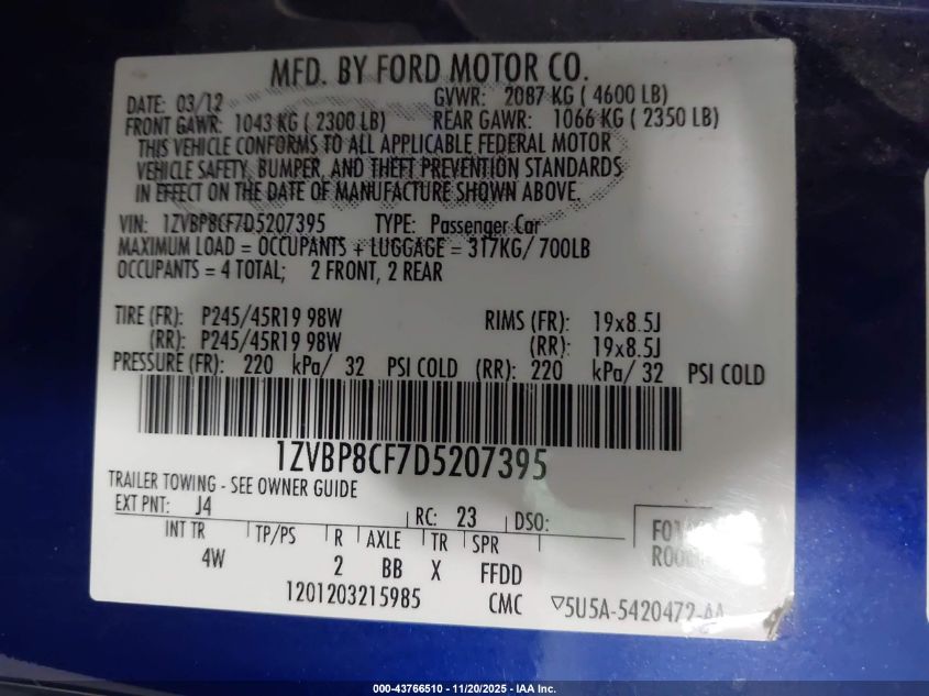 Цвет СинийЦилиндры 8Привод Задний приводVIN 1ZVBP8CF7D5207395Состояние Заводится и едет (проверено)Повреждения Передняя правая AutoRIA