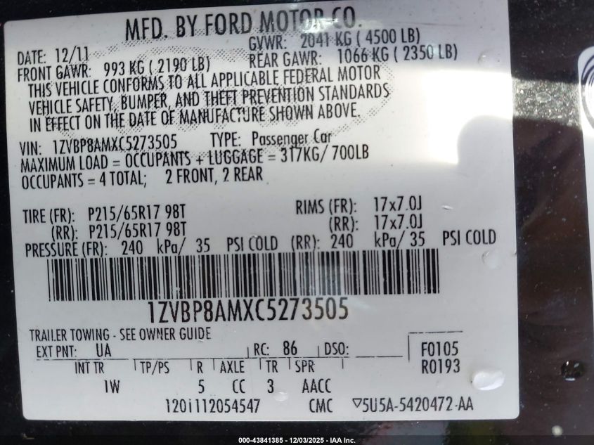 Цвет ЧерныйЦилиндры 6Привод Задний приводVIN 1ZVBP8AMXC5273505Состояние СтационарноПовреждения Обычный износ AutoRIA