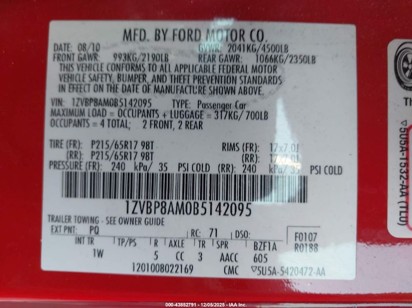 Цвет КрасныйЦилиндры 6Привод Задний приводVIN 1ZVBP8AM0B5142095Состояние Заводится и едет (проверено)Повреждения Левая сторона AutoRIA
