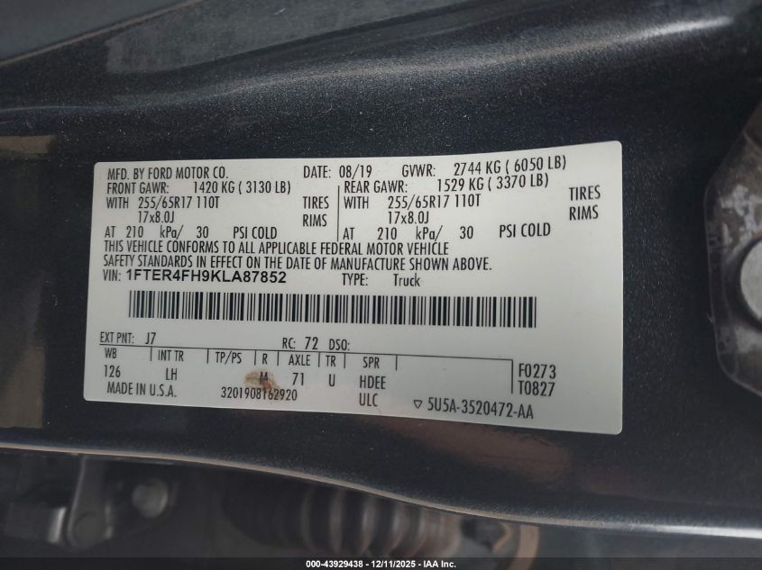 2019 FORD RANGER 2019 року Бензин, 2.3, Полный привод, vin - 1FTER4FH9KLA87852 из США
