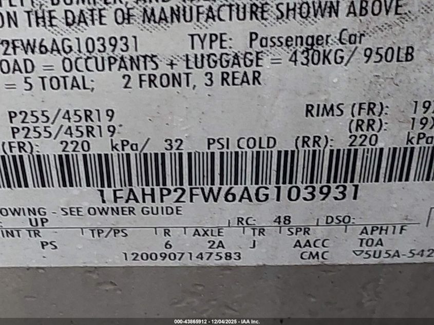 Цвет ЗолотойЦилиндры 6Привод Передний приводVIN 1FAHP2FW6AG103931Состояние СтационарноПовреждения Обычный износДата аукциона 2025-12-12