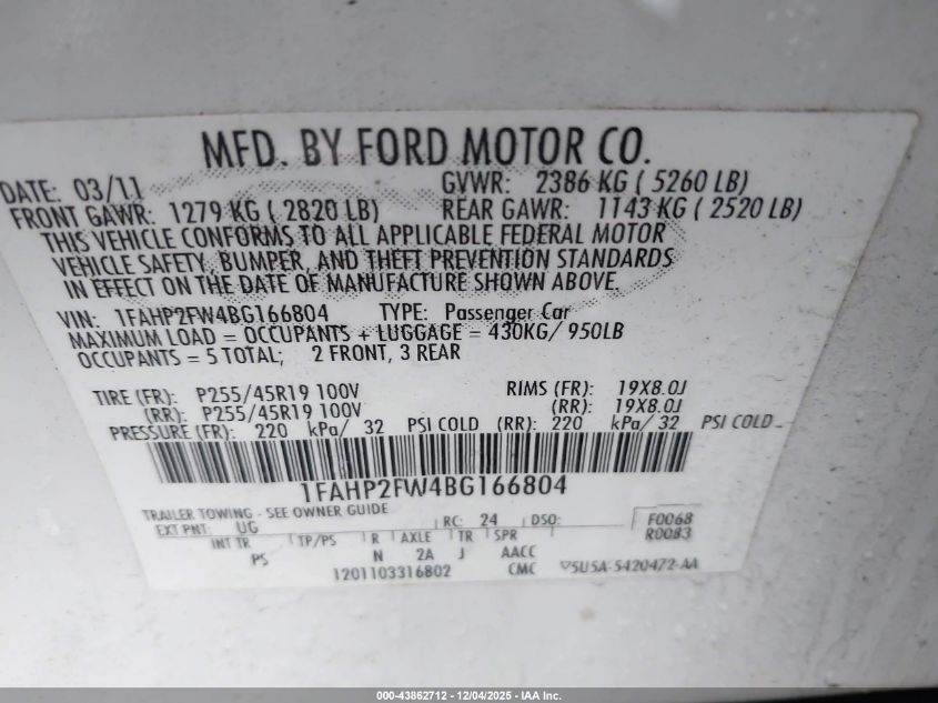 2011 FORD TAURUS 2011 року Бензин, 3.5, Передний привод, vin - 1FAHP2FW4BG166804 из США