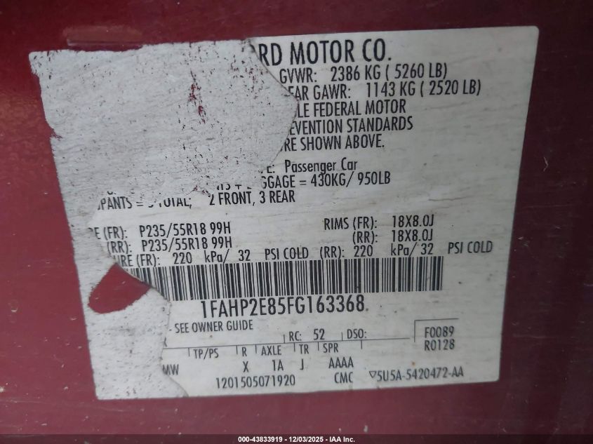 Цвет БордовыйЦилиндры 6Привод Передний приводVIN 1FAHP2E85FG163368Состояние СтационарноПовреждения Незначительные AutoRIA