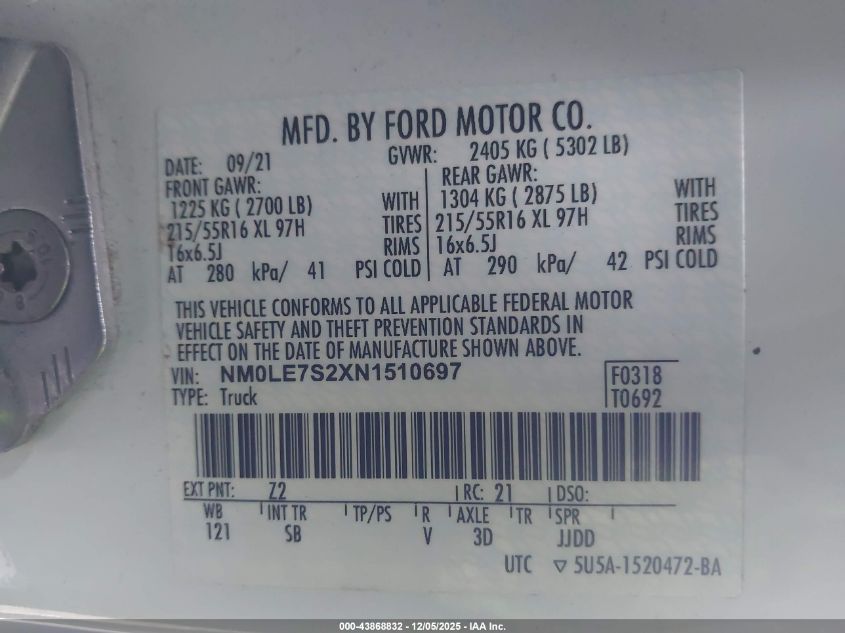 2022 FORD TRANSIT CONNECT 2022 року Бензин, 2.0, Передний привод, vin - NM0LE7S2XN1510697 из США