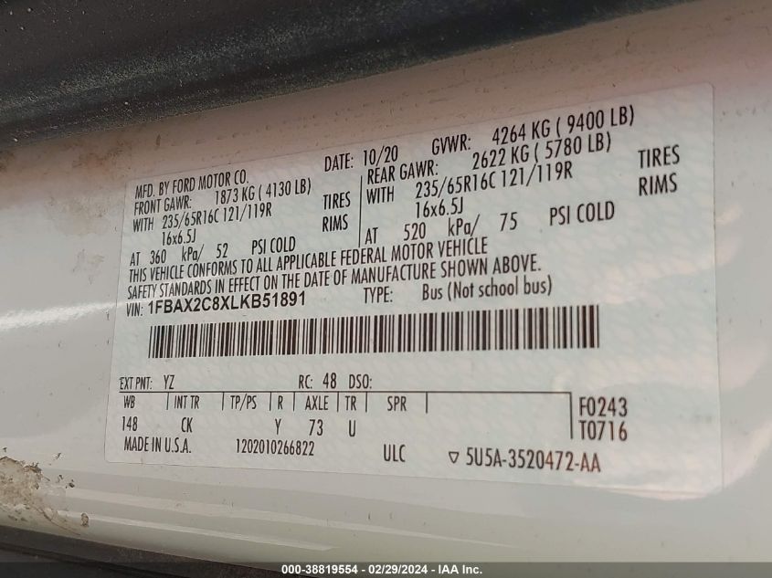 2020 FORD TRANSIT 2020 року Бензин, 3.5, Задний привод, vin - 1FBAX2C8XLKB51891 из США