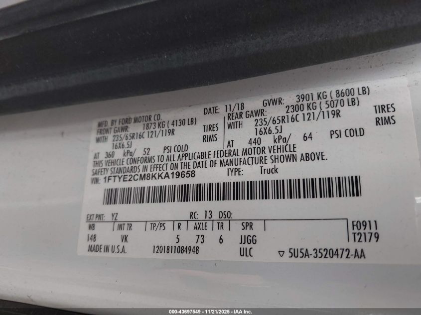 2019 FORD TRANSIT 2019 року Бензин, 3.7, Задний привод, vin - 1FTYE2CM8KKA19658 из США