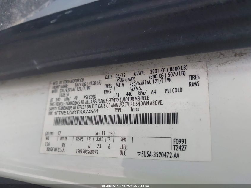 2015 FORD TRANSIT 2015 року Бензин, 3.7, Задний привод, vin - 1FTNE1ZM1FKA74561 из США