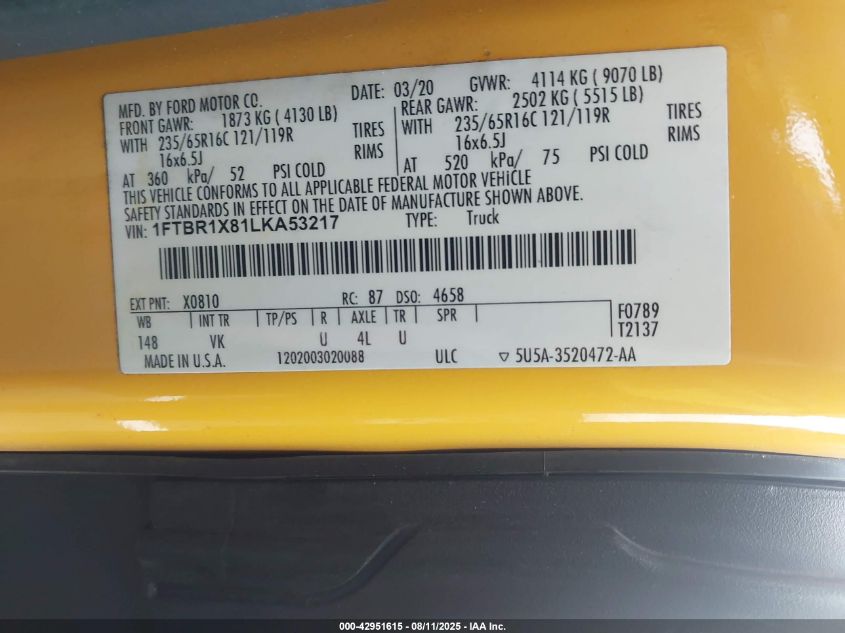 Цвет ЖелтыйЦилиндры 6Привод Задний приводVIN 1FTBR1X81LKA53217Состояние СтационарноПовреждения Передняя или задняяДата аукциона 2025-12-10 AutoRIA