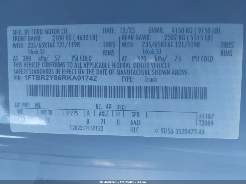 2024 FORD TRANSIT 2024 року Бензин, 3.5, Полный привод, vin - 1FTBR2Y86RKA01742 из США