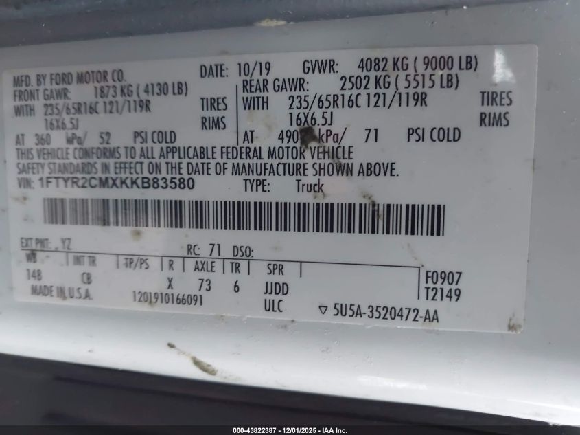 2019 FORD TRANSIT 2019 року Бензин, 3.7, Задний привод, vin - 1FTYR2CMXKKB83580 из США