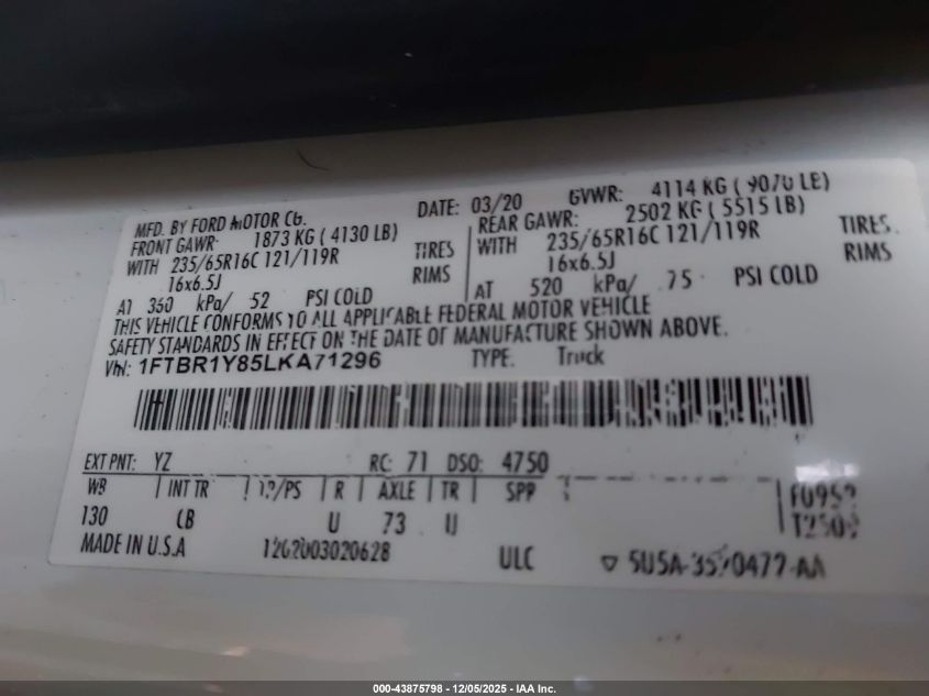 2020 FORD TRANSIT 2020 року Бензин, 3.5, Задний привод, vin - 1FTBR1Y85LKA71296 из США