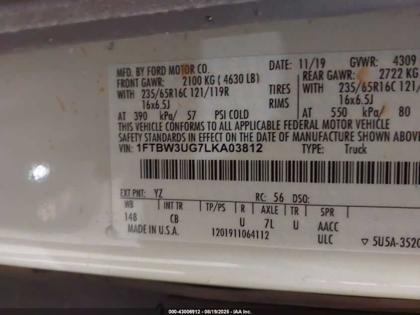 2020 FORD TRANSIT 2020 року Бензин, 3.5, Полный привод, vin - 1FTBW3UG7LKA03812 из США