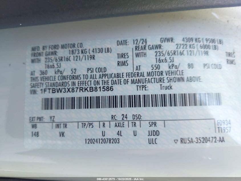 2024 FORD TRANSIT 2024 року Бензин, 3.5, Задний привод, vin - 1FTBW3X87RKB81586 из США