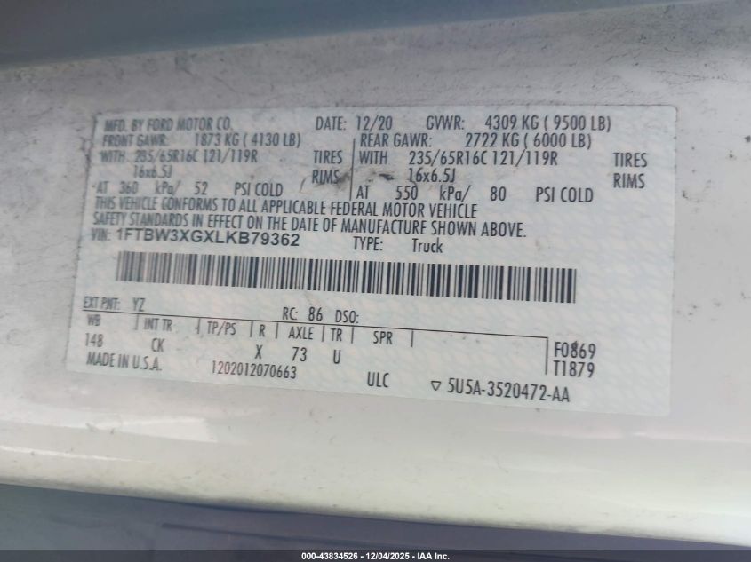 Цвет БелыйЦилиндры 6Привод Задний приводVIN 1FTBW3XGXLKB79362Состояние Заводится и едет (проверено)Повреждения Передняя или задняя AutoRIA