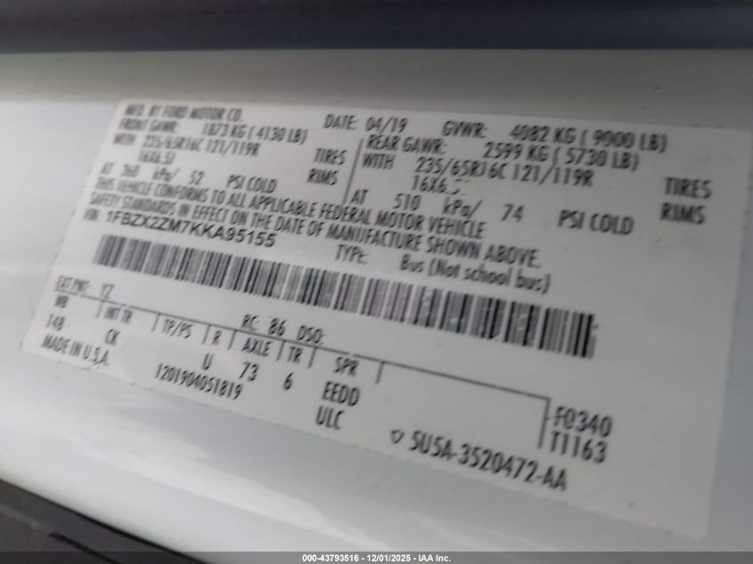 Цвет БелыйЦилиндры 6Привод Задний приводVIN 1FBZX2ZM7KKA95155Состояние СтационарноПовреждения Передняя или задняя AutoRIA