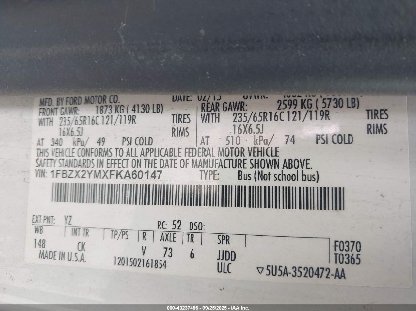Цвет БелыйЦилиндры 6Привод Задний приводVIN 1FBZX2YMXFKA60147Состояние СтационарноПовреждения Био/Химические AutoRIA