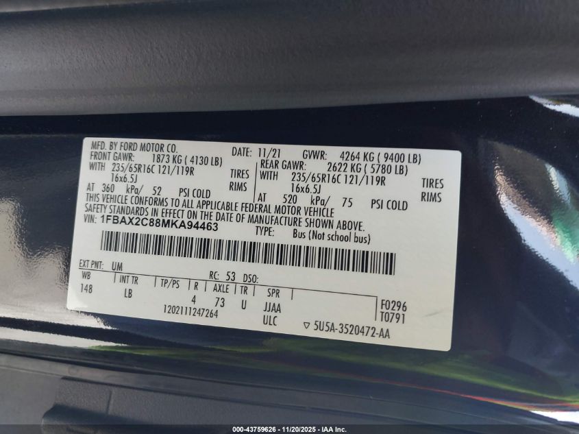 2021 FORD TRANSIT 2021 року Бензин, 3.5, Задний привод, vin - 1FBAX2C88MKA94463 из США