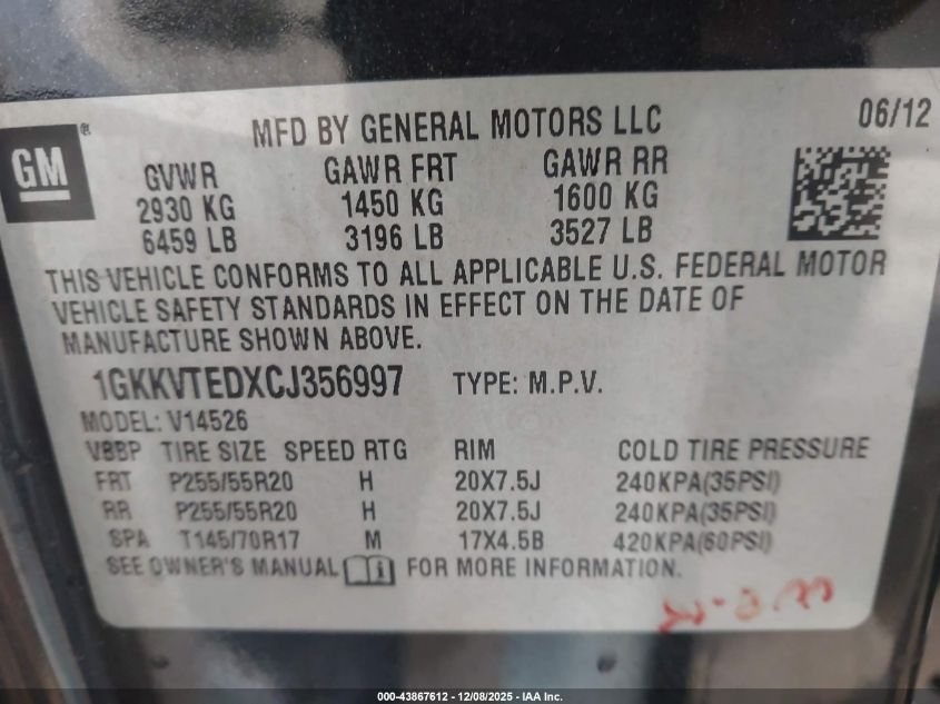 2012 GMC ACADIA 2012 року Бензин, 3.6, Полный привод, vin - 1GKKVTEDXCJ356997 из США