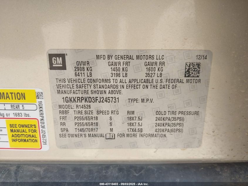Цвет ЗолотойЦилиндры 6Привод Передний приводVIN 1GKKRPKD3FJ245731Состояние СтационарноПовреждения Передняя или задняяДата аукциона 2025-12-10 AutoRIA