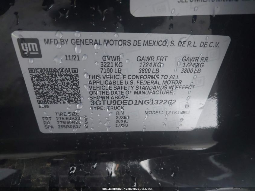 2022 GMC SIERRA 1500 2022 року Бензин, 5.3, Полный привод, vin - 3GTU9DED1NG132262 из США