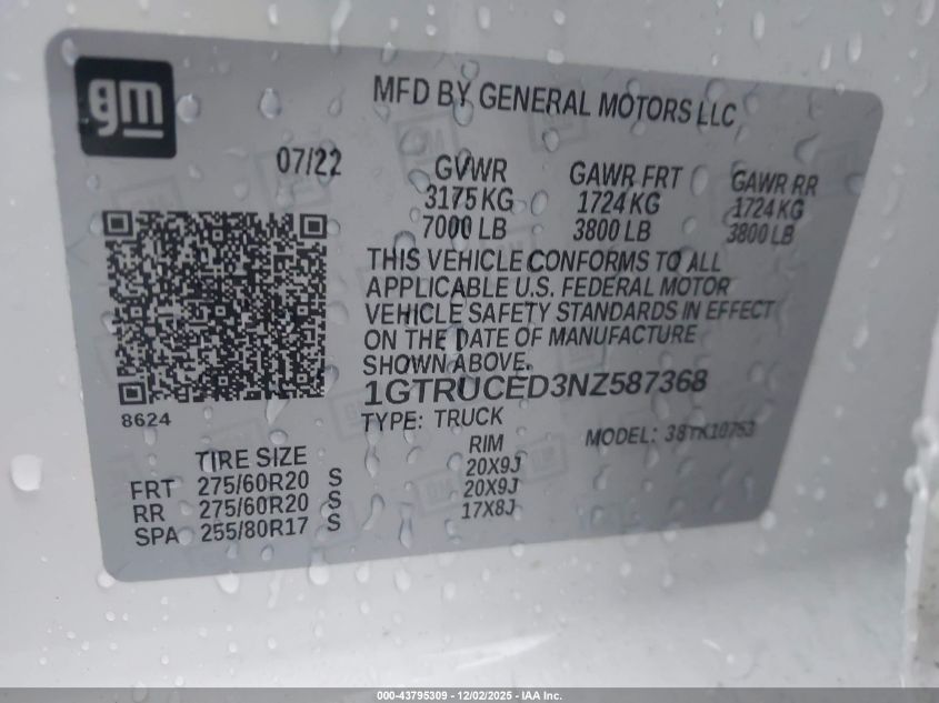 2022 GMC SIERRA 1500 2022 року Бензин, 5.3, Полный привод, vin - 1GTRUCED3NZ587368 из США