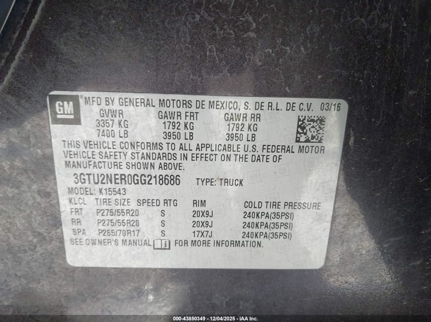 2016 GMC SIERRA 1500 2016 року Бензин, 5.3, Полный привод, vin - 3GTU2NER0GG218686 из США