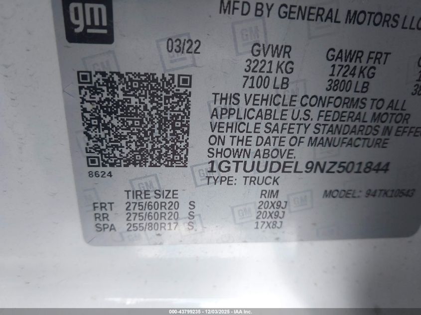 Цвет БелыйЦилиндры 8Привод Полный приводVIN 1GTUUDEL9NZ501844Состояние СтационарноПовреждения Передняя или задняя