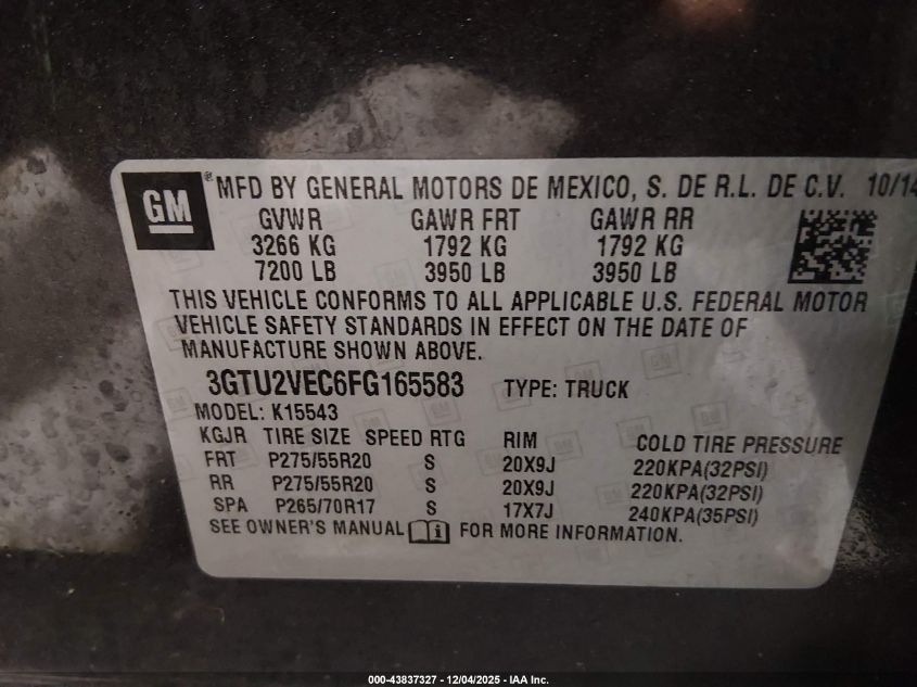 2015 GMC SIERRA 1500 2015 року Бензин, 5.3, Полный привод, vin - 3GTU2VEC6FG165583 из США