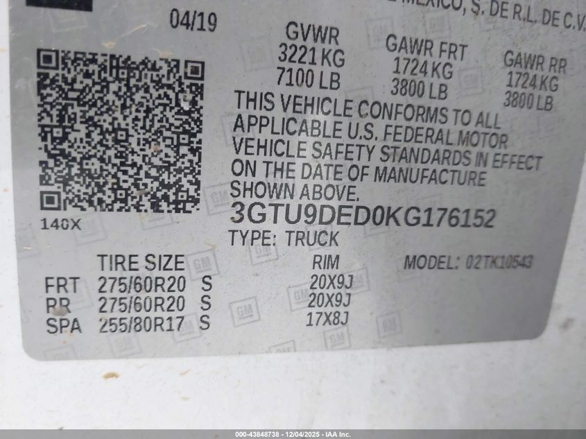Цвет БелыйЦилиндры 8Привод Полный приводVIN 3GTU9DED0KG176152Состояние Заводится и едет (проверено)Повреждения Передняя и задняя