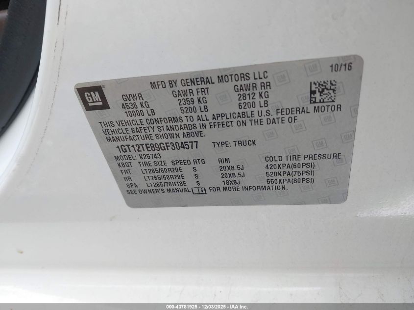 Цвет БелыйЦилиндры 8Привод Полный приводVIN 1GT12TE89GF304577Состояние СтационарноПовреждения Передняя левая