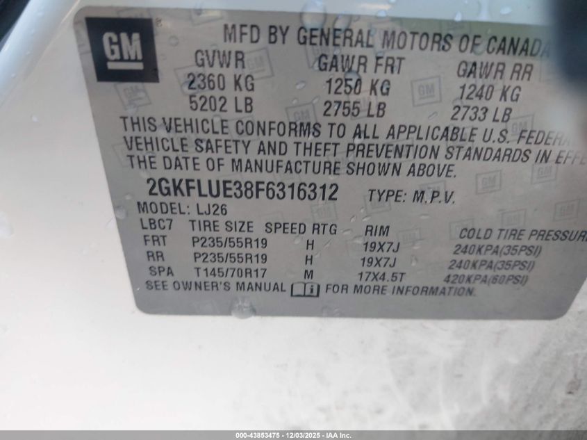 Цвет БелыйЦилиндры 6Привод Передний приводVIN 2GKFLUE38F6316312Состояние СтационарноПовреждения Обычный износ AutoRIA