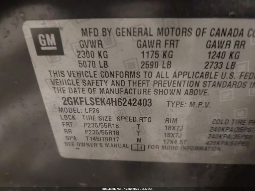 Цвет СерыйЦилиндры 4Привод Полный приводVIN 2GKFLSEK4H6242403Состояние Заводится и едет (проверено)Повреждения Передняя или задняя AutoRIA