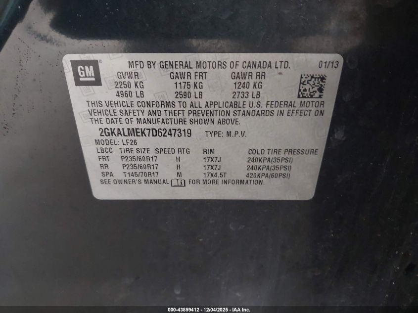 Цвет ЧерныйЦилиндры 4Привод Передний приводVIN 2GKALMEK7D6247319Состояние СтационарноПовреждения Механические поврежденияДата аукциона 2025-12-12 AutoRIA