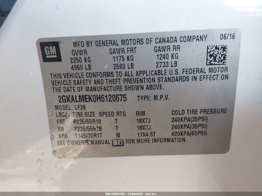 Цвет БелыйЦилиндры 4Привод Передний приводVIN 2GKALMEK0H6120675Состояние Заводится и едет (проверено)Повреждения Левая сторона AutoRIA