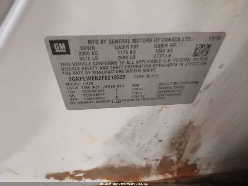 Цвет БелыйЦилиндры 4Привод Полный приводVIN 2GKFLWEK2F6218525Состояние Заводится и едет (проверено)Повреждения Передняя или задняя AutoRIA