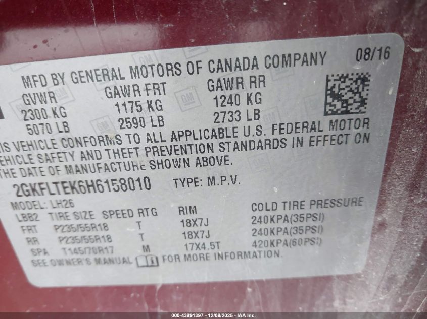 Цвет БордовыйЦилиндры 4Привод Полный приводVIN 2GKFLTEK6H6158010Состояние СтационарноПовреждения Передняя или задняя AutoRIA