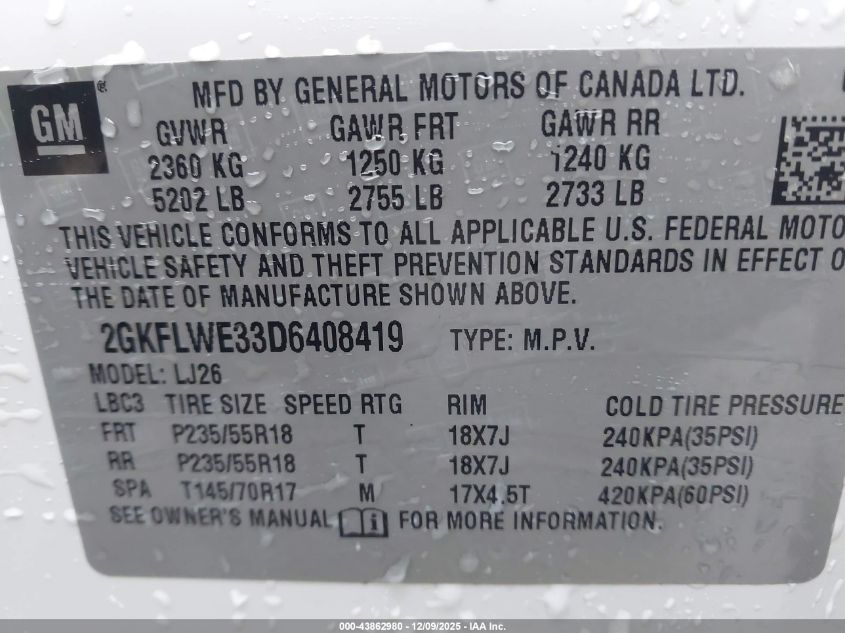 Цвет БелыйЦилиндры 6Привод Передний приводVIN 2GKFLWE33D6408419Состояние Заводится и едет (проверено)Повреждения Передняя или задняя AutoRIA