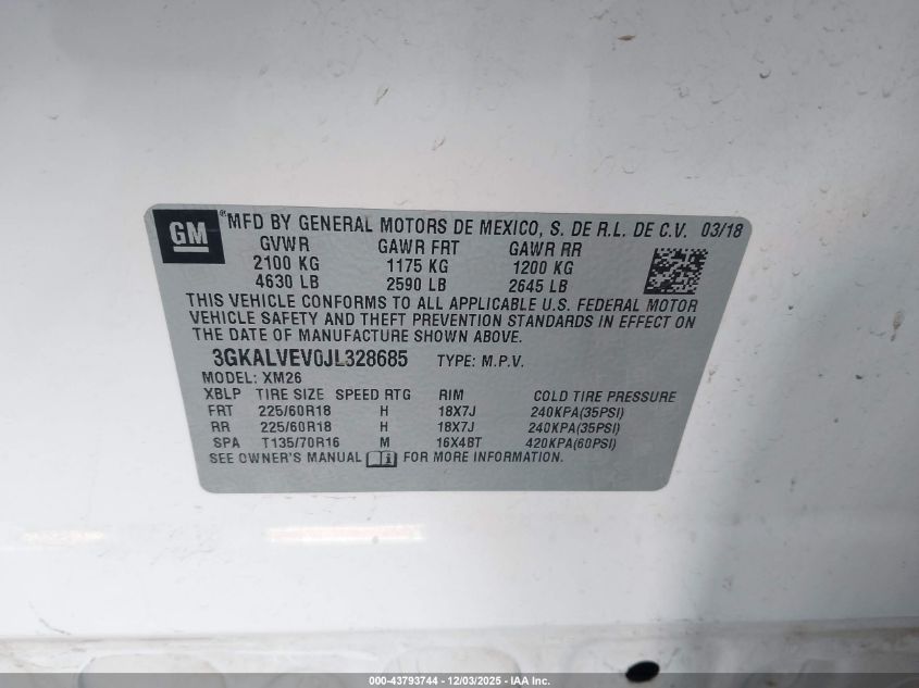 Цвет БелыйЦилиндры 4Привод Полный приводVIN 3GKALVEV0JL328685Состояние Заводится и едет (проверено)Повреждения Передняя или задняя AutoRIA