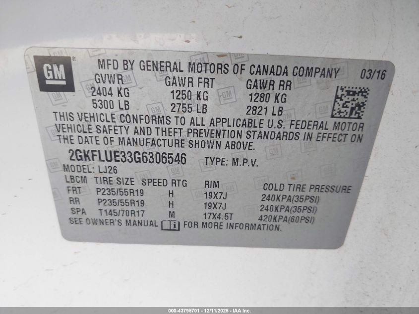 Цвет БелыйЦилиндры 6Привод Полный приводVIN 2GKFLUE33G6306546Состояние Заводится и едет (проверено)Повреждения Передняя правая AutoRIA